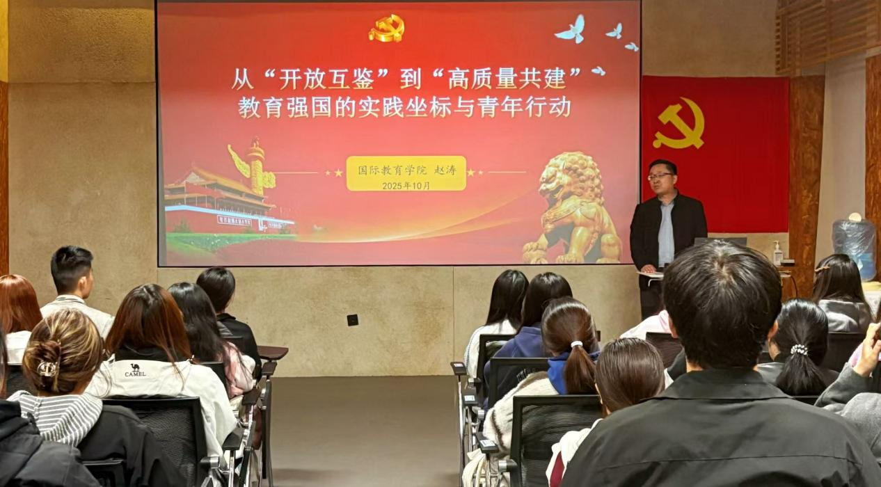 2025年10月9日,河南工程学院国际教育学院院长赵涛为第37期入党积极分子培训班,讲授《从“开放互鉴”到“高质量共建”:教育强国的实践坐标与青年行动》专题党课,深化入党积极分子同学对教育强国战略的认知,明确青年责任担当。