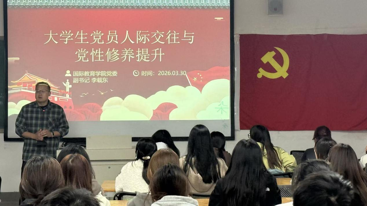 为做好入党积极分子的培养教育工作,切实加强大学生党员党性修养,引导其明晰交往准则、锤炼政治品格,充分发挥青年党员先锋模范作用,2026年3月30日晚上,国际教育学院党委副书记李载东为学院入党积极分子讲授《大学生党员人际交往与党性修养提升》专题党课。