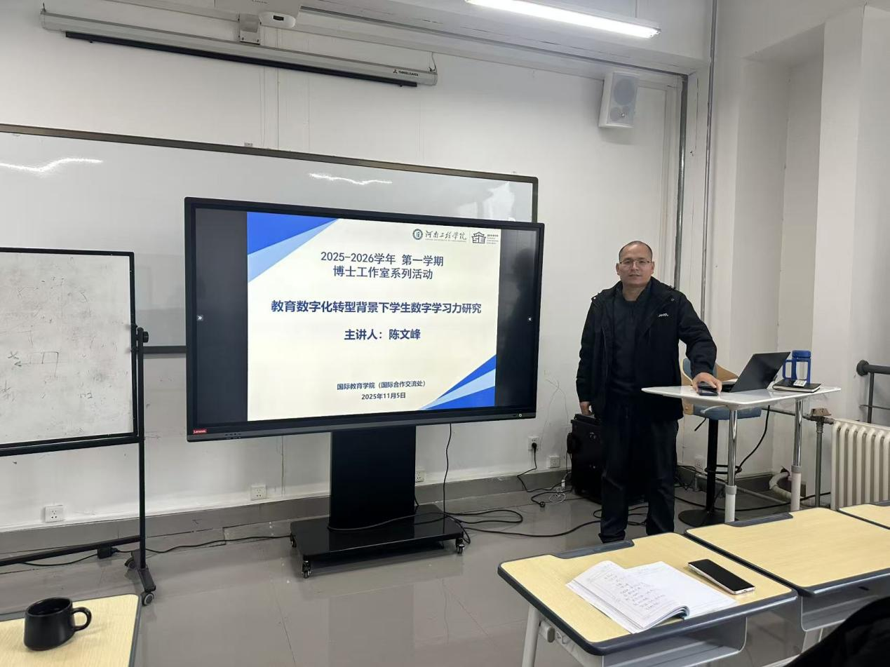 2025年11月5日下午,我院在8306教室开展博士工作室系列学术活动。本次活动由学院教师陈文峰博士主讲,主题为《教育数字化转型背景下学生数字学习力研究》。赵涛院长、褚钰副院长出席活动,学院博士及在读博士教师参与了本次交流。