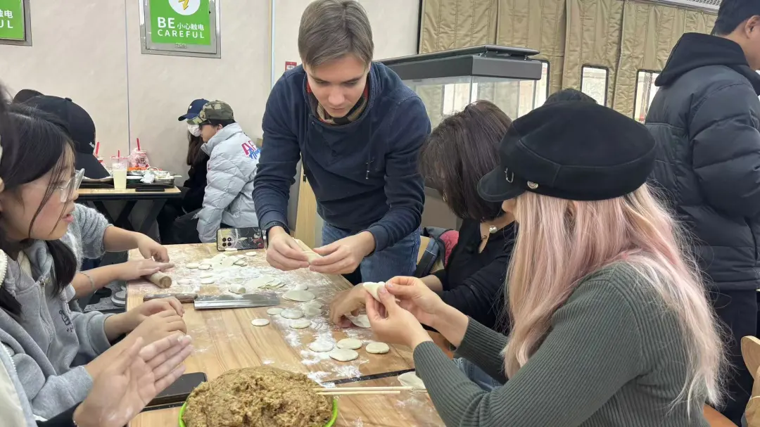活动现场暖意融融,面粉、鲜肉、蔬菜等食材与各类工具早已整齐陈列,处处透着温馨氛围。活动启动后,大家迅速分工、默契配合,和面、擀皮、包馅,一道道工序有条不紊。外教老师们的积极参与成为活动中一道独特风景线。他们怀着浓厚兴趣加入包饺子行列,在党员同志和学生的耐心指导下,从生疏试探到逐渐上手,一个个形态各异、充满“国际范儿”的饺子应运而生。现场欢声笑语不断,团结友爱、其乐融融的氛围感染着每一位参与者。当一碗碗热气腾腾的饺子端上餐桌,师生们围坐一团,共同品尝亲手包制的美味,鲜香在舌尖弥漫,笑容在脸上绽放,温暖在心中流淌。