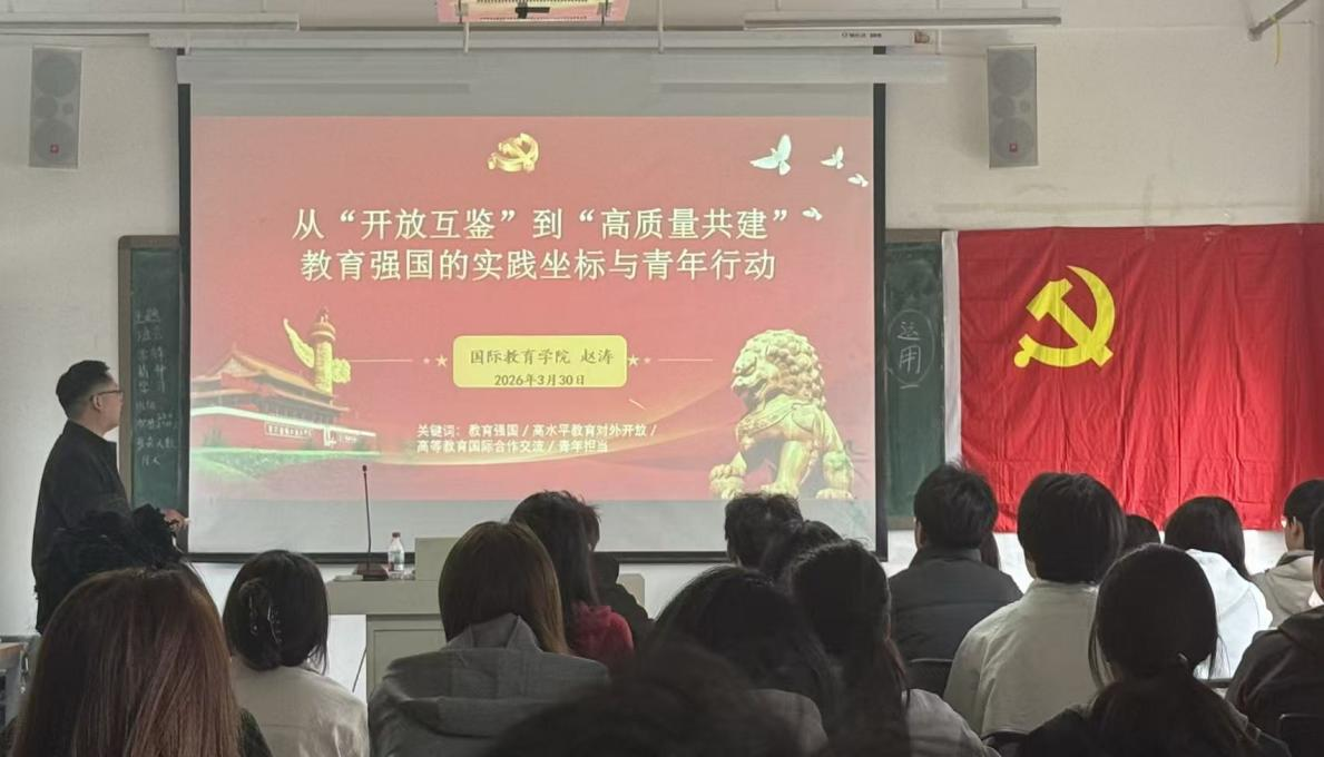 为做好入党积极分子的培养教育工作,引导其在教育强国建设中找准定位、践行担当,2026年3月30日,国际教育学院院长赵涛为入党积极分子培训班讲授《从“开放互鉴”到“高质量共建”——教育强国的实践坐标与青年行动》专题党课。