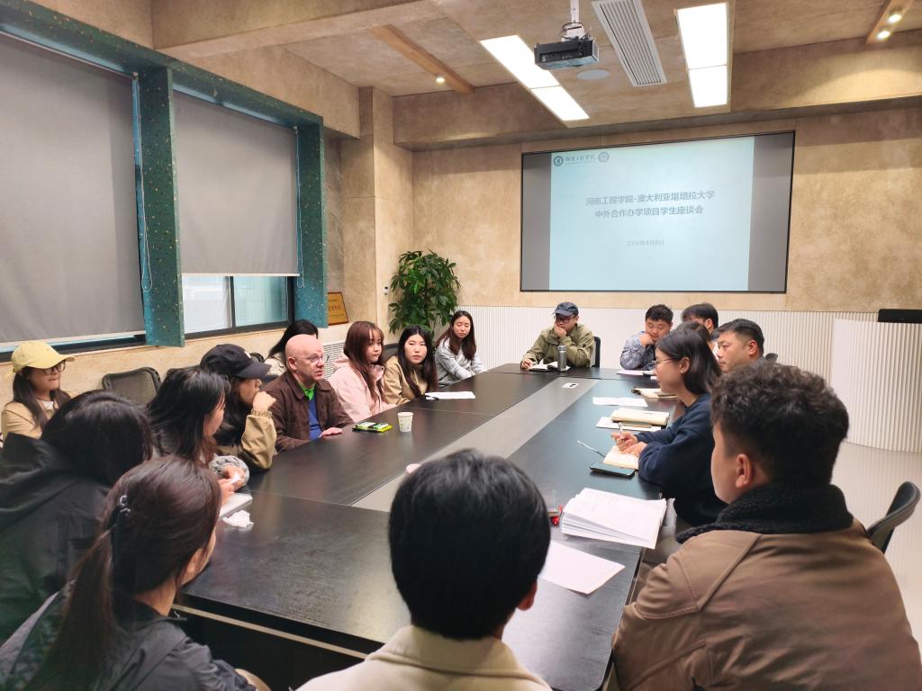 为进一步了解我院中外合作办学项目学生在视觉传达设计专业外方教学期间的学习情况,倾听学生对外教教学方式、课程安排等方面的意见建议,持续提升人才培养质量,4月8日下午,我院召开“河南工程学院-澳大利亚堪培拉大学中外合作办学项目”学生座谈会。学院党委副书记李载东、副院长田珂,外方授课老师、中方教师代表及学生代表参加会议。