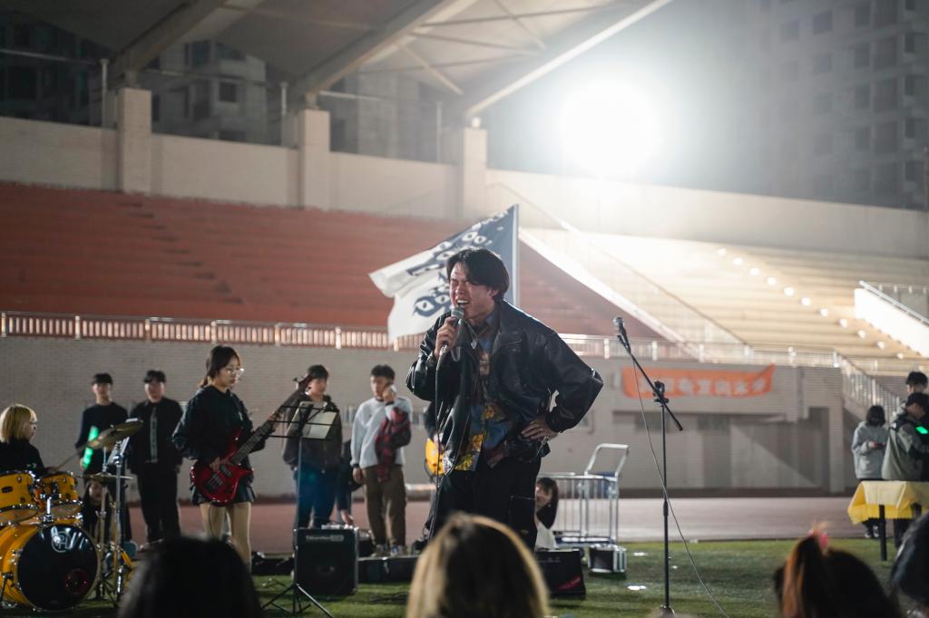 微风下的操场伴随着青春的热浪铺开了一场盛大的乐队音乐演出。热情四射的摇滚串烧拉开序幕,来自我院的失眠摇滚乐队组成的强大歌手阵容轮番登场,用音乐燃爆全场;独唱歌手张金博的励志歌曲《一万次悲伤》伴随着轻柔的音乐、和着微凉的晚风,唱出了大学生青春的果敢和期许,引得无数同学欢呼,使得全场气氛达到高潮。